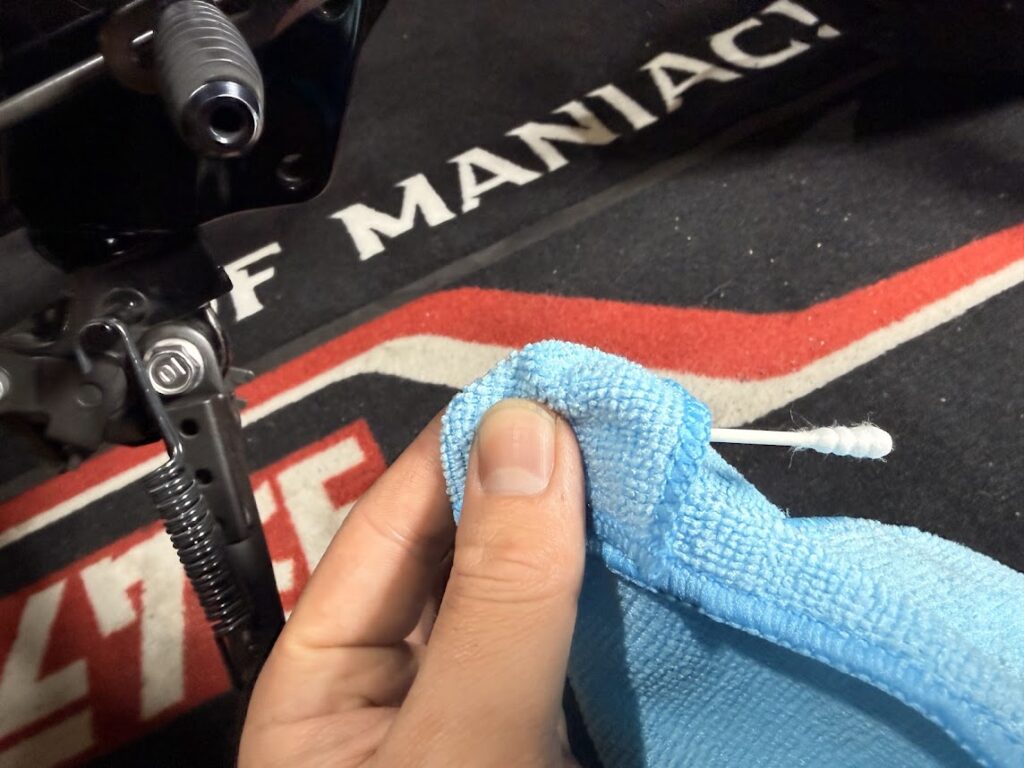 掃除しにくいフィンの間は、綿棒にマイクロファイバークロスを被せて拭き取ります。