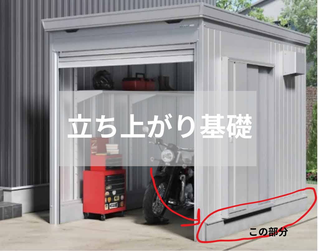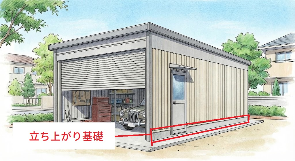 「ガレージの立ち上がり基礎」とは、ガレージの建物を地面の湿気や水から守るための「土台の壁」のことです。