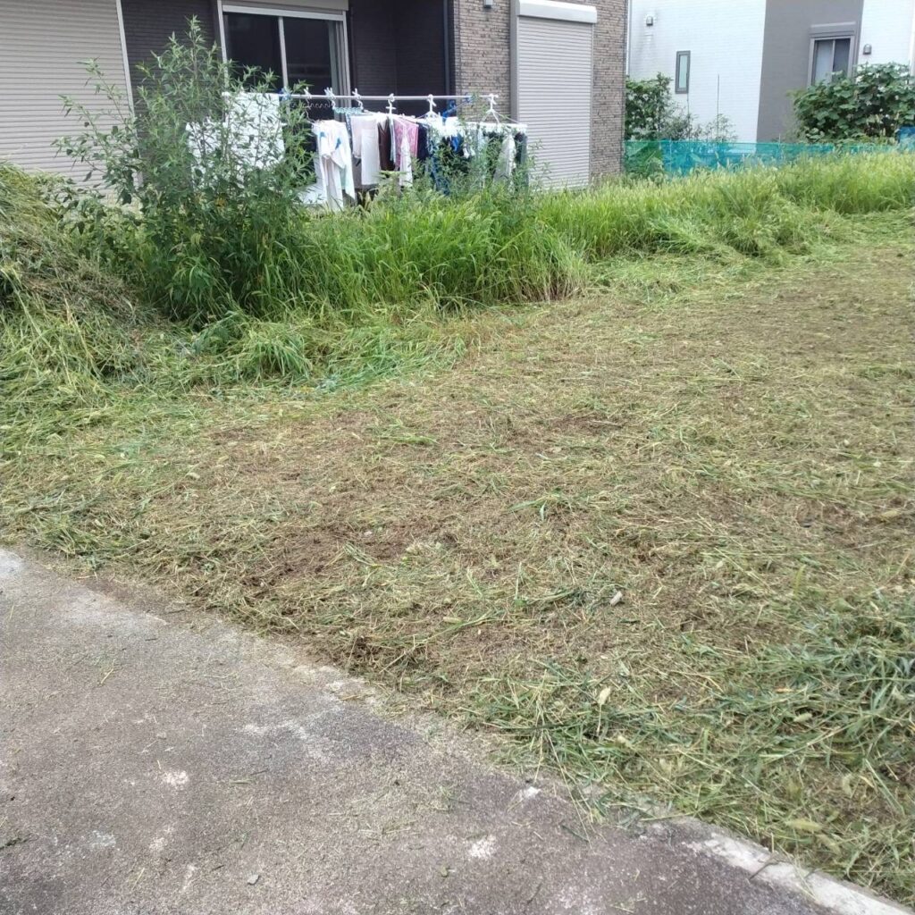 カタログを渡してもらうついでに軽く見に来ていただいたので、ここらへんに建てたいと伝えていた場所付近を、ついでにサービスで草刈りもしておきましたとの事。