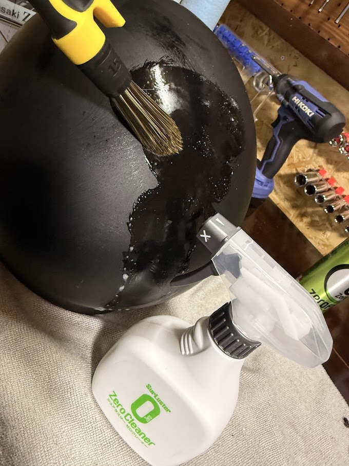 ゼロクリーナーを軽く吹付けながら、ホイールブラシで優しく掃除していきます。