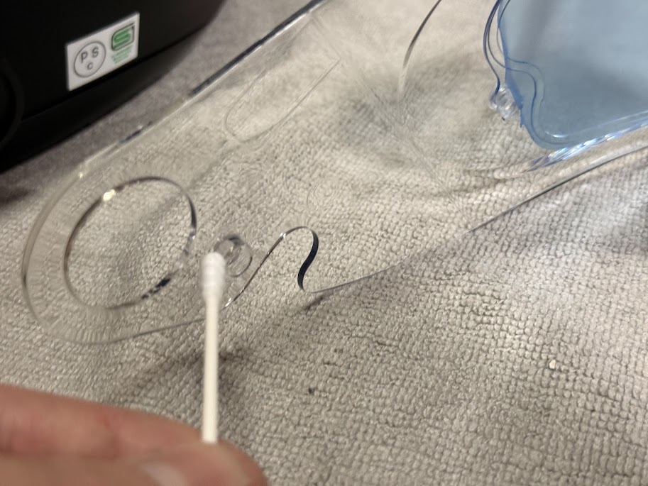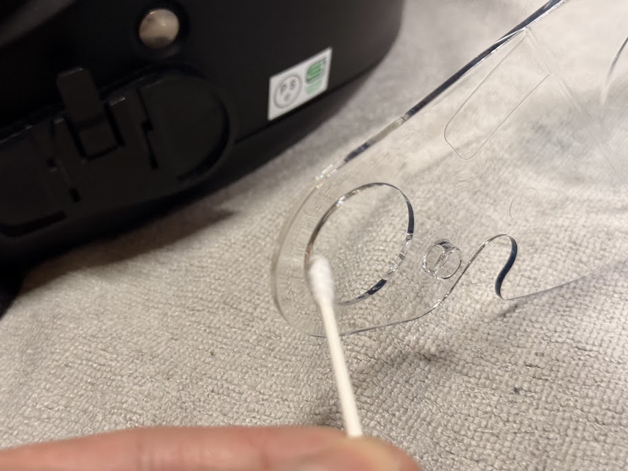 1️⃣シールドの、シールドベースに当たる部分の内側(画像1枚目の綿棒を当ててる面)