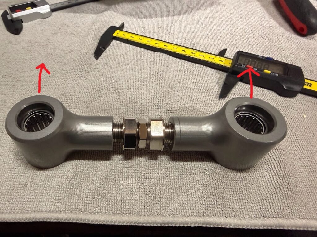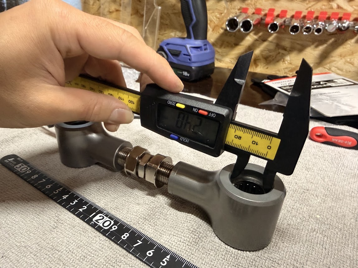 設定したいセンター間の長さ-24して、ロッドエンド内側~内側を、その数字に合わせればOKです。※(センター間を150mmにしたい場合、150mmー24mm=ノギスで126mmに合わせる)