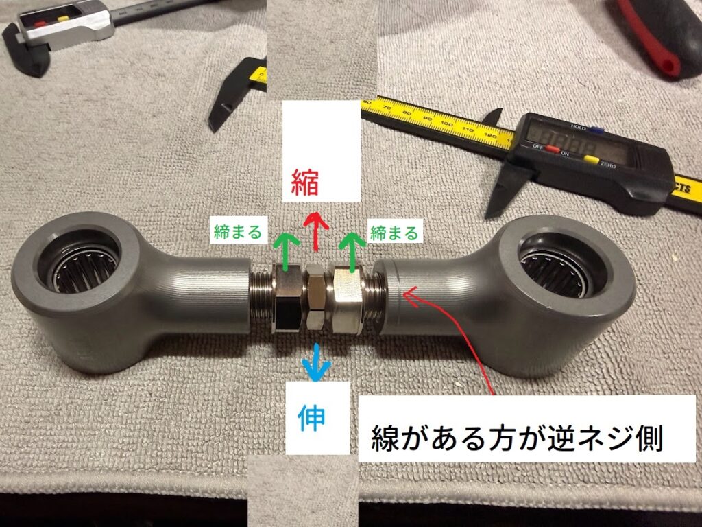 ロッドエンドのセンターとセンター間の距離で車高調整する。