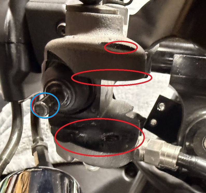 ピボットボルトとマスターシリンダー(レバーホルダー部)にグリス汚れがついているので、パーツクリーナーで洗浄します。