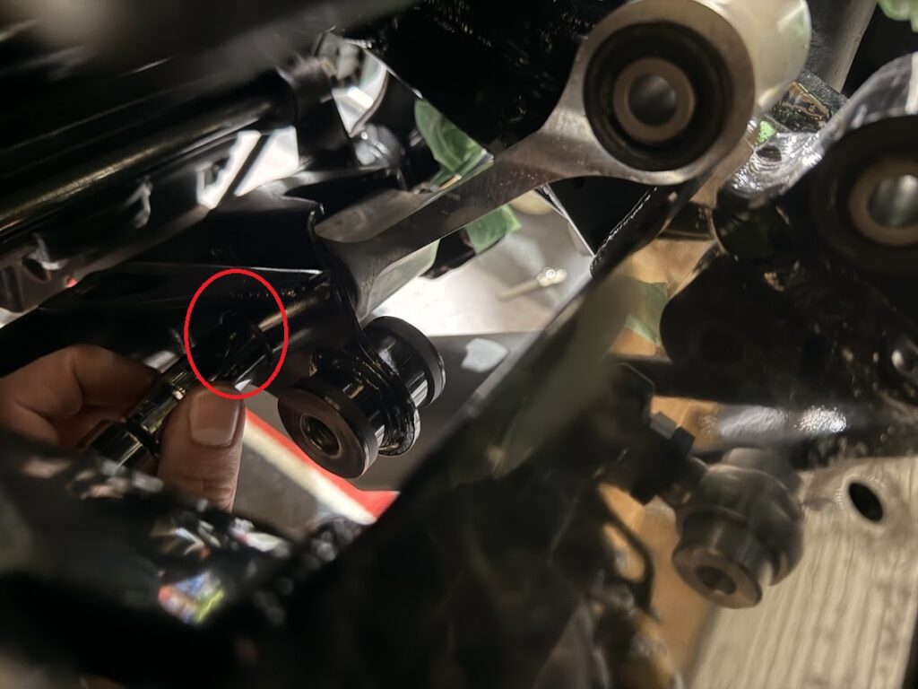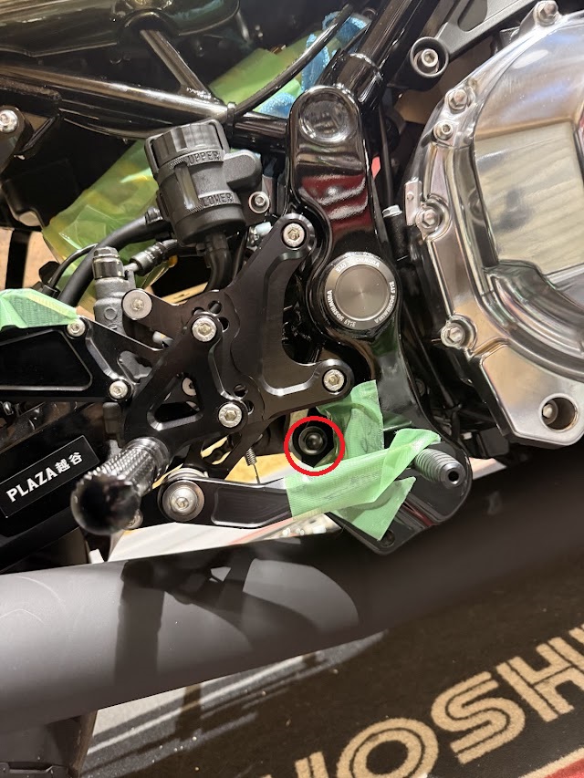 OverRacingのバックステップの場合は、ステップ取り外しなしでボルトとナットにアクセス出来ました。右側はエクステンションバーを使用し、左側は長いタイプの14mmソケットで外せます。