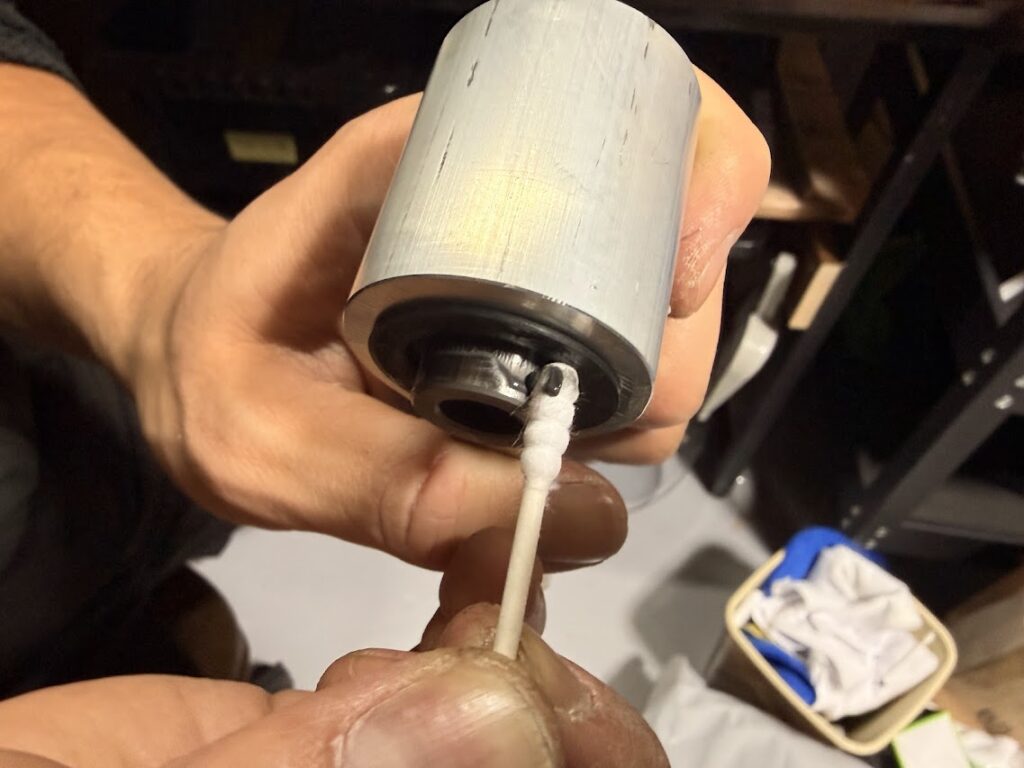 ですが、ベアリング内の拭き取りがしづらいので、樹脂ケージを傷つけないように気をつけながら綿棒やウエスで拭き取りすると良いです。