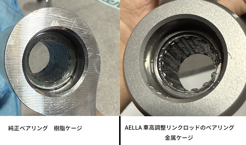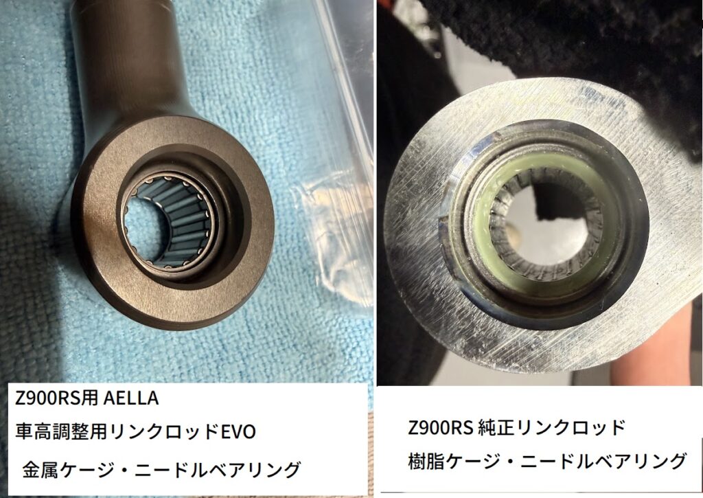 Z900RSの純正で使われているのは樹脂ケージでしたが、AELLA車高調整リンクロッドは金属ケージでした。