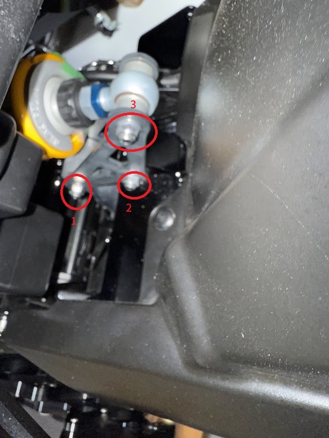 1️⃣画像1~2枚目の赤丸のボルトを5mmの六角で外します。