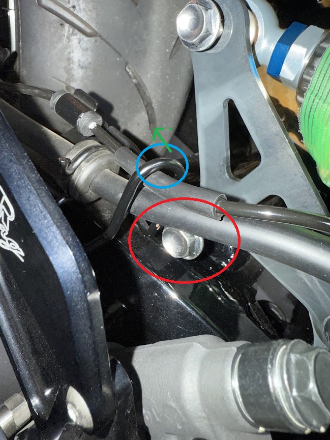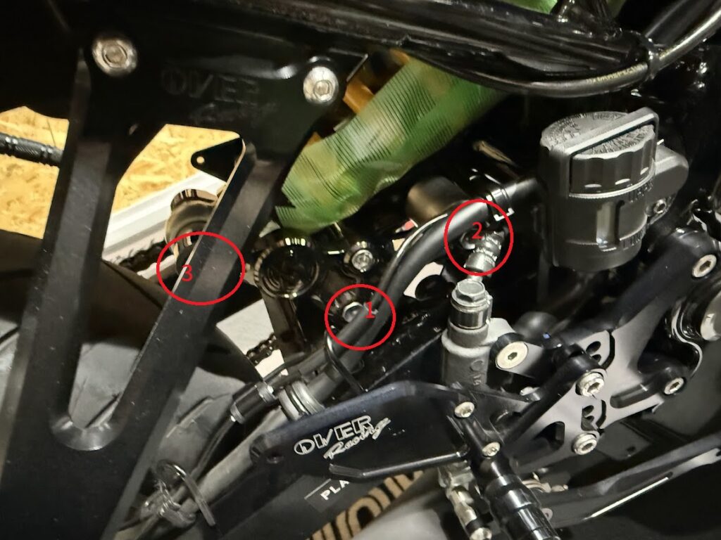 2番赤丸→エクステンションバーだとリアステップのステーに干渉してしまうため、ソケットのみ