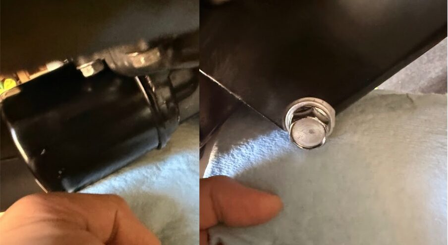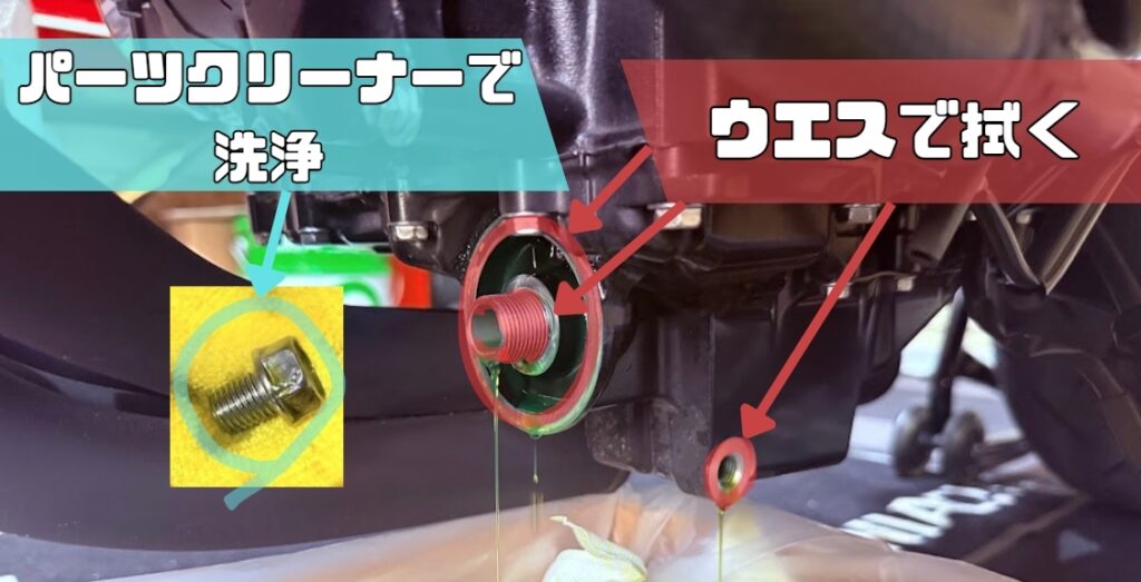 ドレンボルトはパーツクリーナーで洗浄し、ドレンボルト取り付け部・オイルフィルター取り付け部はウエスで軽く拭きます。