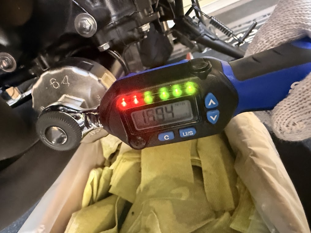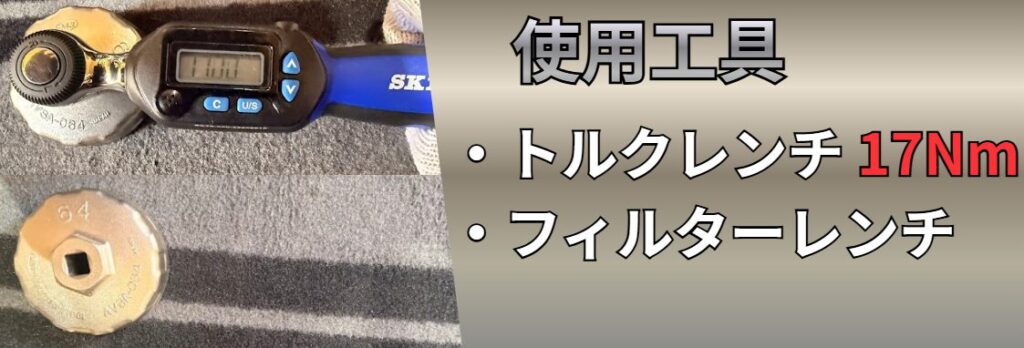 オイルフィルターを手で締めれる所まで締めてから、トルクレンチで規定トルクの17Nmで締めます。