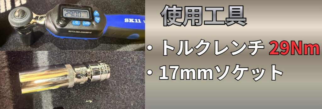 | トルクレンチ | ・TORUK トルクレンチ プレセット型 差込角 9.5mm (3/8インチ) 5-60N·m | ・ドレンボルト=29Nm ・オイルフィルター=17Nm |
