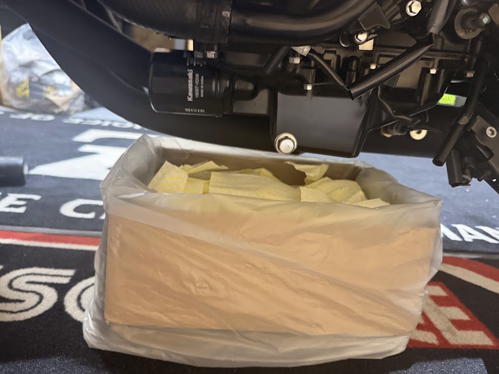 オイルフィルターを取り外すと真下にオイルが垂れるので、ポイパックの位置を調整しなおします。