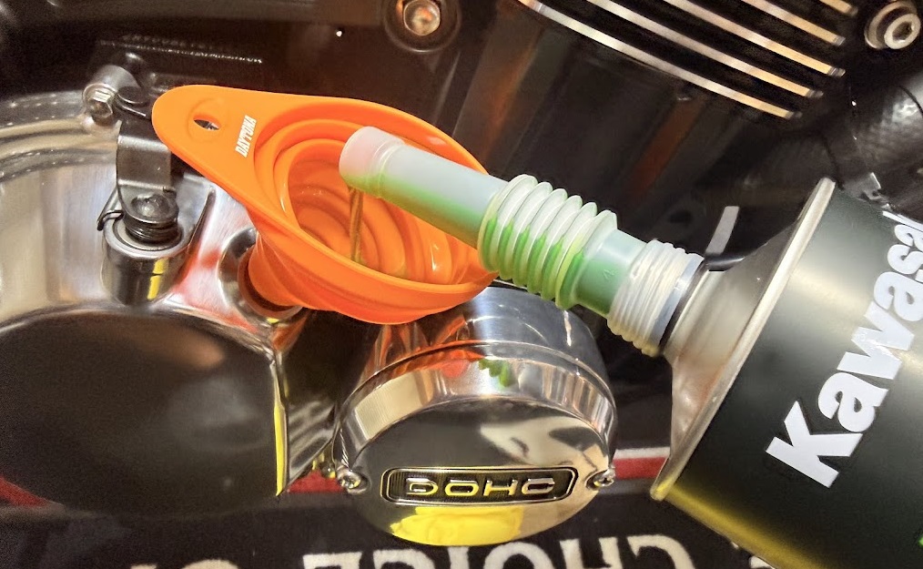 | シリコン漏斗(必要ではないがあると便利) | ・デイトナ(Daytona) バイク 漏斗 エンジンオイル交換 折り畳み式 コンパクトシリコンジョウゴ 79018 | ・オイル注入時のオイル溢れを防ぐ ・間口が広がるためオイルを注入しやすくなる |
