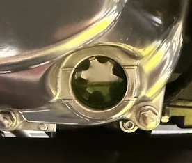 車体を垂直にした状態で窓からオイル量がアッパーとロウの真ん中から少し上位にあるか確認します。